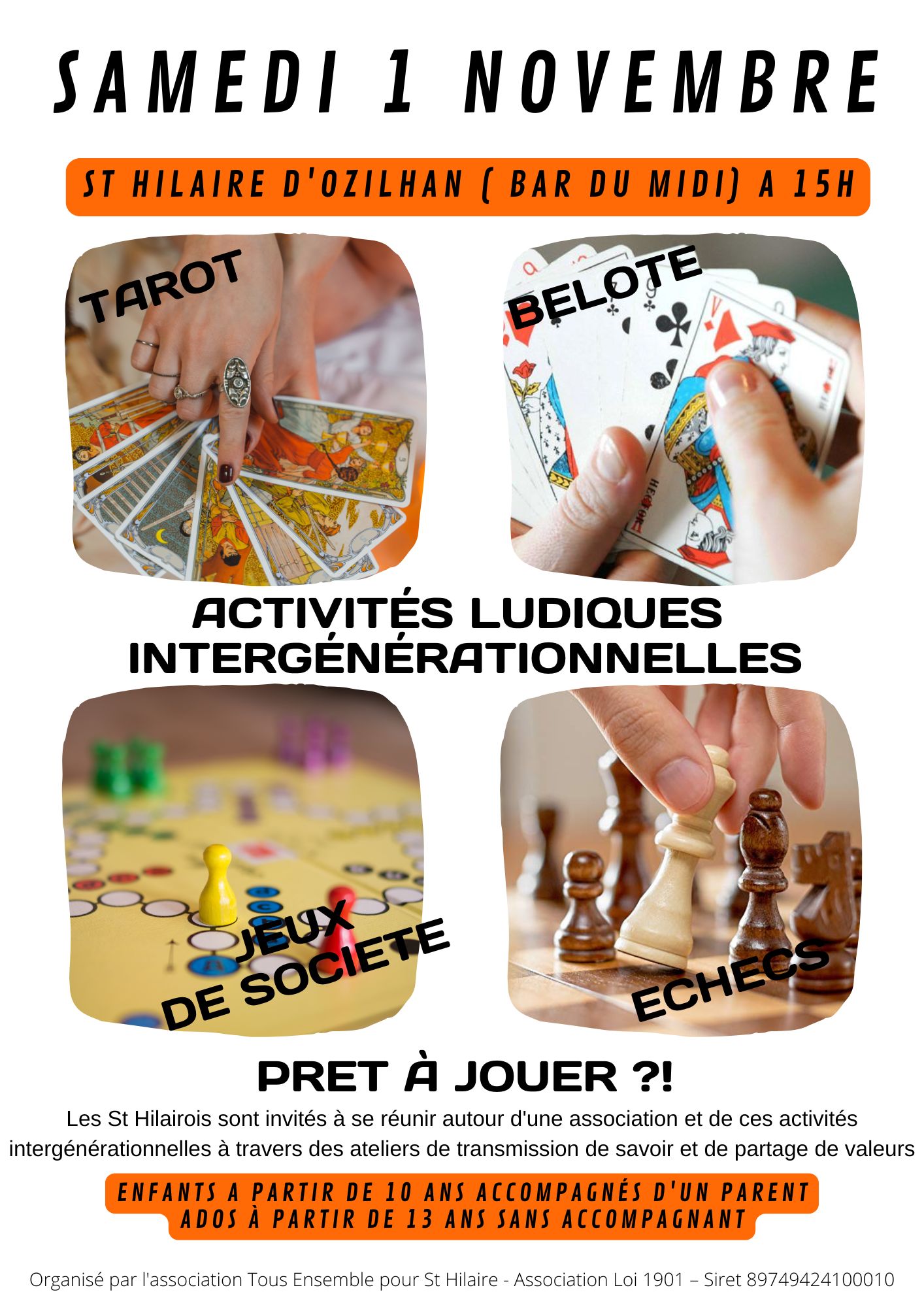 Bonjour à tous, On vous donne rdv le samedi 1 novembre à partir de 15h au bar du midi à St Hilaire d'Ozilhan pour notre rencontre mensuel autour de diverses activités (belote, tarot, pétanque, jeux de société divers ...) ou simplement discuter et rencontrer du monde. Sortez de chez vous, et rejoignez-nous.