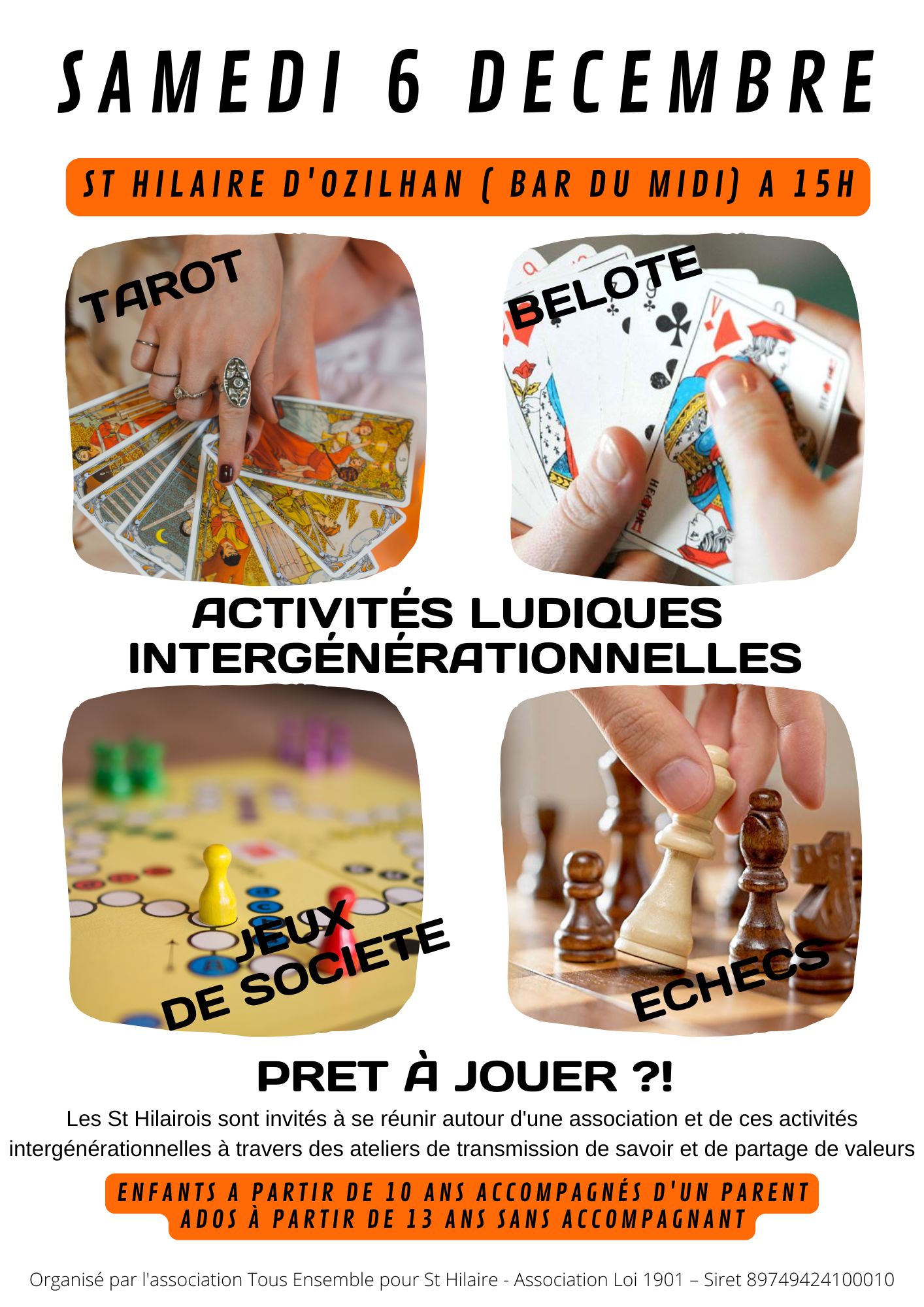 Bonjour à tous, On vous donne rdv le samedi 6 décembre à partir de 15h au bar du midi à St Hilaire d'Ozilhan pour notre rencontre mensuel autour de diverses activités (belote, tarot, pétanque, jeux de société divers ...) ou simplement discuter et rencontrer du monde. Sortez de chez vous, et rejoignez-nous.